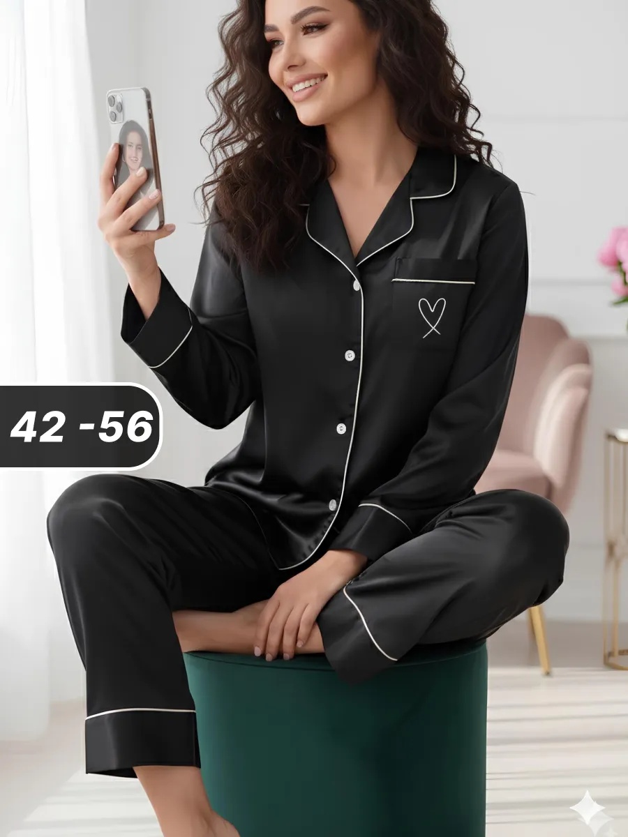 Шелковая пижама женская в элегантной черной расцветке — сочетание комфорта и утончённого стиля. Тренд 2025-2026 года .Комплект включает рубашку на пуговицах с длинными рукавами и брюки на комфортной эластичной резинке. Свободный крой не сковывает движений, при этом выгодно подчеркивает достоинства женской фигуры.